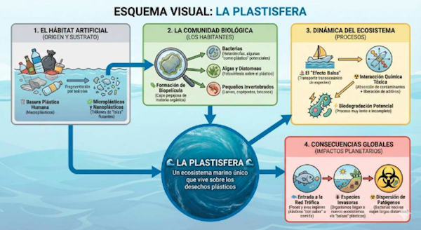 La Plastisfera es el ecosistema microbiano que se forma sobre la superficie de los plásticos cuando llegan al medio ambiente, especialmente al agua del mar. En cuestión de horas, bacterias, algas microscópicas, hongos y otros microorganismos se adhieren al plástico y crean un biofilm: una capa pegajosa que funciona como hábitat y refugio. Cada fragmento de microplástico se convierte así en una pequeña “isla” artificial donde prospera vida microbiana muy distinta a la del agua que lo rodea.