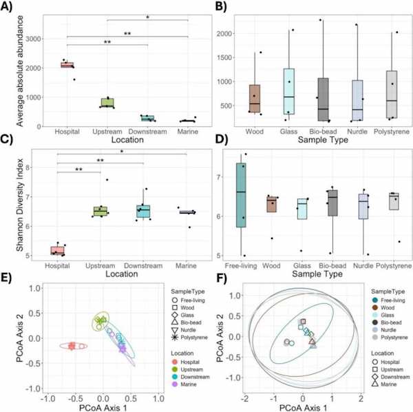 C) Índice de diversidad de Shannon por ubicación. La diversidad es significativamente menor en aguas hospitalarias y aumenta progresivamente en aguas arriba y aguas abajo. En el entorno marino se estabiliza en valores intermedios. Este patrón indica que la mezcla de contaminantes y las condiciones variables del agua modifican la complejidad de los biofilms que se forman sobre los plásticos.